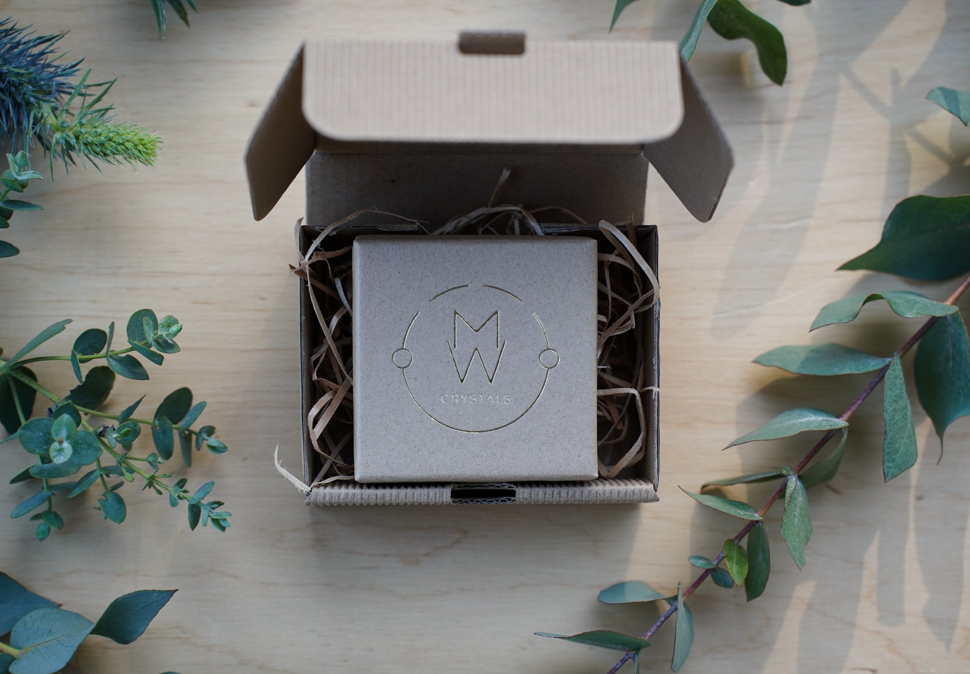 Biżuteria pakowana w eleganckie, tekturowe pudełeczko, naenergetyzowana wibracją kryształowej misy czakry serca i otulona dobrym słowem.