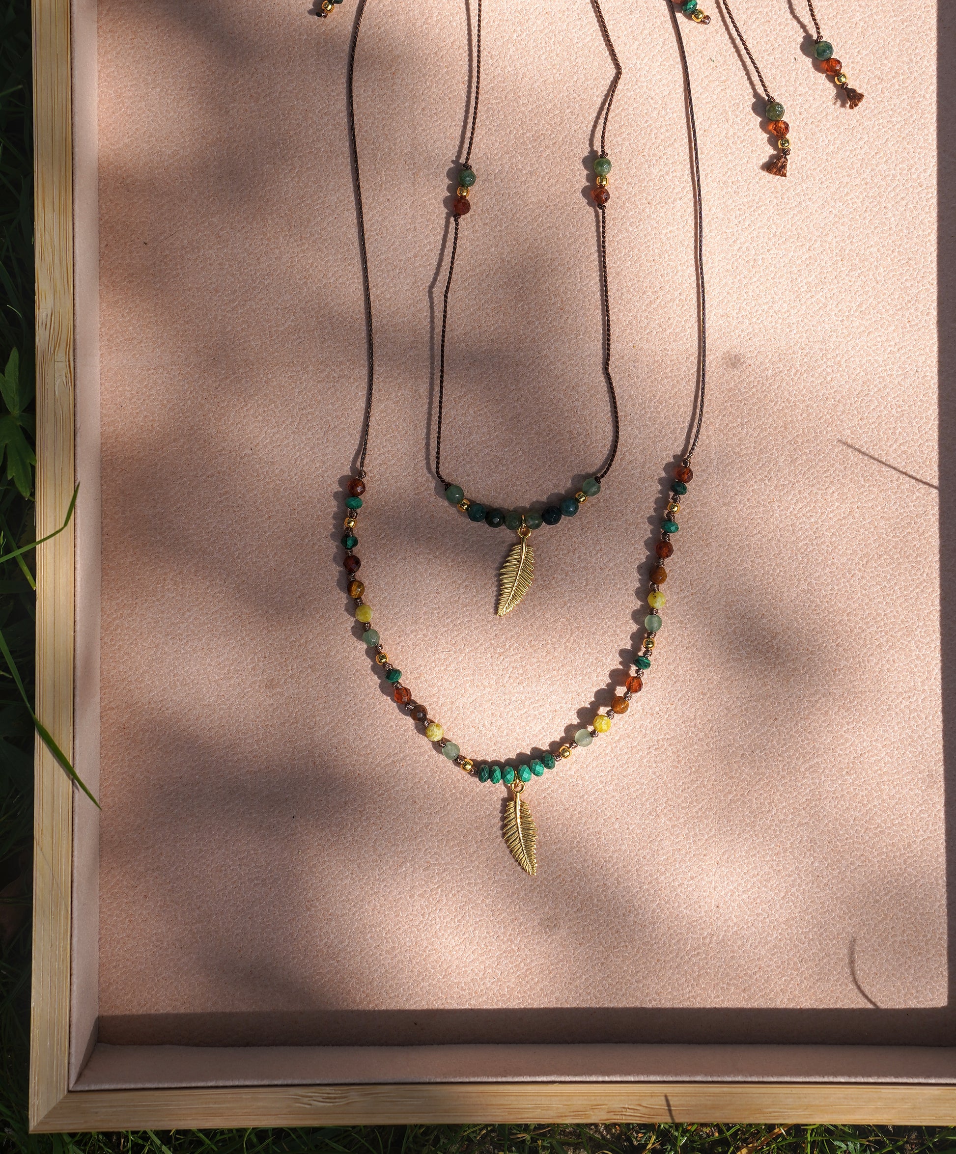 Zawieszka i przekładki powstały z wysokiej jakości srebra próby 925, pokrytego 24-karatowym złotem. Zapięcie wykonane z makramowego splotu, dzięki któremu długość naszyjnika można dowolnie regulować i idealnie dopasować do każdej stylizacji.